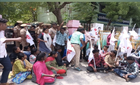 தனியார் பள்ளிகளில் ஏழை மாணவர்களுக்கு வழங்க வேண்டிய 25 சதவீத இட ஒதுக்கீட்டிற்கான நிதியை உடனடியாக விடுவிக்க வேண்டும் என வலியுறுத்தி திருச்சி மாவட்ட முதன்மை கல்வி அலுவலர் அலுவலகத்தை முற்றுகையிட்டு இந்திய மாணவர் சங்கத்தினர் போராட்டத்தில் ஈடுபட்டனர். அப்போது கோஷங்களை எழுப்பியவாறு முதன்மை கல்வி அதிகாரி அலுவலகத்திற்குள் நுழைய முயன்ற மாணவர் சங்கத்தினருக்கும் போலீசாருக்கும் இடையே தள்ளுமுள்ளு ஏற்பட்டது. தொடர்ந்து அவர்கள் அப்பகுதியில் சாலை மறியல் போராட்டத்தில் ஈடுபட்டனர் போராட்டத்தில் ஈடுபட்டவர்களை போலீசார் கைது செய்தனர்.இந்தப் போராட்டத்தால் சிறிது நேரம் அப்பகுதியில் பரபரப்பு ஏற்பட்டது.