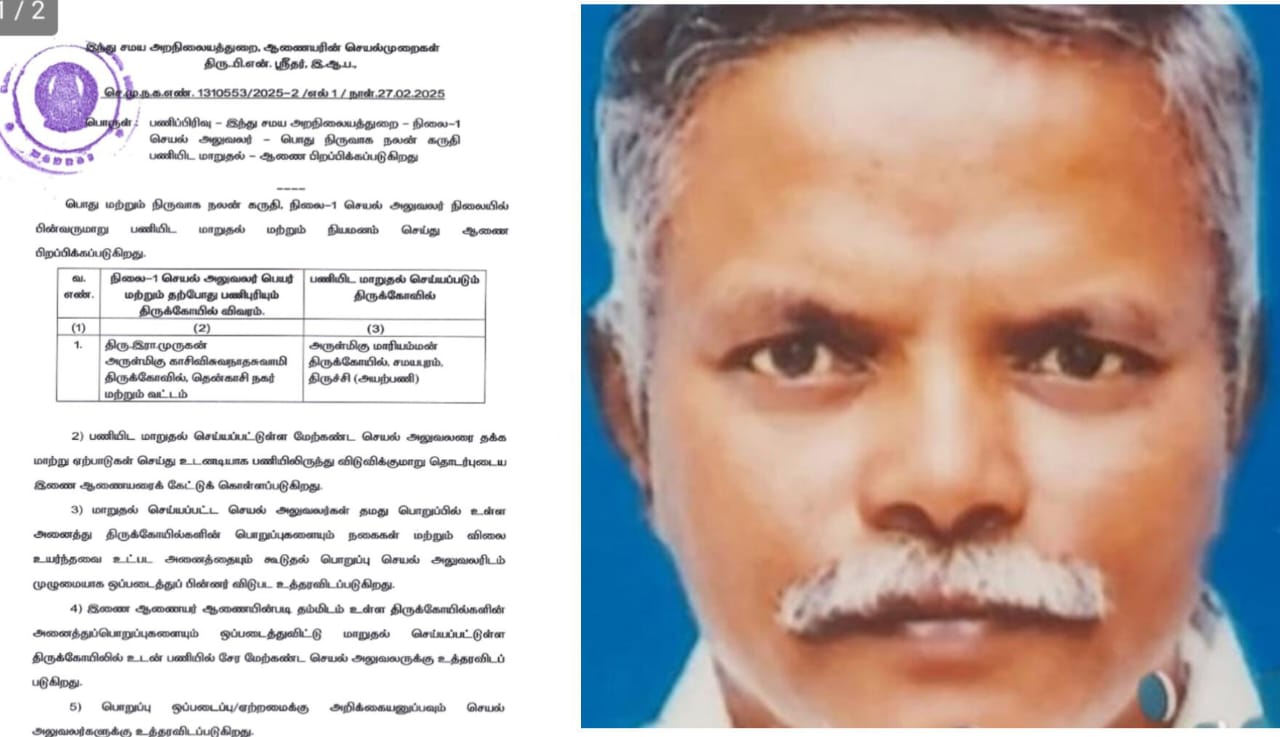 தொடர் குற்றசாட்டுகளால் தென்காசி காசி விஸ்வநாதர் ஆலய செயல் அலுவலர் முருகன் சமயபுரம் கோவிலுக்கு பணியிடை மாற்றம்.